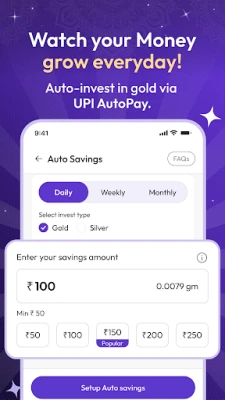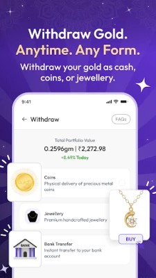 सोने में निवेश करना अब पहले से कहीं ज़्यादा आसान और सुरक्षित हो गया है! Aura Gold ऐप के साथ, आप अपनी उंगलियों पर सोने की ख़रीद-फ़रोख़्त का अनुभव कर सकते हैं। महज़ ₹10 की छोटी शुरुआत के साथ अपने सुनहरे भविष्य की नींव रखें और अपनी बचत को बढ़ते हुए देखें। बाज़ार की हर हलचल पर नज़र रखें, क्योंकि Aura Gold आपको सोने की लाइव दरें पल-पल अपडेट करता रहता है, जिससे आप हमेशा सही समय पर स्मार्ट फ़ैसले ले सकें। यह सुविधा सुनिश्चित करती है कि आपका निवेश हमेशा सूचित और लाभदायक हो।
