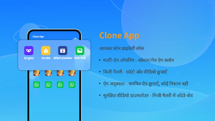 XClone App या Clone App एक ऐप क्लोनर और निजी वॉल्ट है। यह एंड्रॉइड वर्चुअलाइज़ेशन का उपयोग करके ऐप्स को छिपाता है और समानांतर जगह बनाता है। WhatsApp, Facebook जैसे सोशल और गेमिंग ऐप्स क्लोन करें, मल्टी-अकाउंट प्रबंधित करें और अपनी गोपनीयता सुरक्षित रखें।