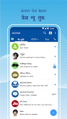 जियोचैट आपको अपनों से सहज और सुरक्षित रूप से जोड़े रखने के लिए डिज़ाइन किया गया एक सच्चा भारतीय संचार साथी है। चाहे आप जियो या किसी अन्य मोबाइल नंबर का उपयोग करें, JioChat आपको अपने मोबाइल नेटवर्क या वाई-फाई के माध्यम से तुरंत जुड़ने की सुविधा देता है। दुनिया भर में फैले अपने दोस्तों और परिवार के साथ क्रिस्टल-क्लियर HD वॉयस और वीडियो कॉल का अनुभव करें, जहाँ कॉलिंग टैरिफ की चिंता अब गुजरे जमाने की बात है। JioChat के साथ, हर बातचीत एक अनुभव है।